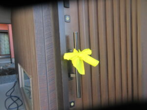 警報と共に安否確認の黄色い布を家の前に結びます。私もまちセンへ安否報告後、増川区で行われた自主防災会議に参加。