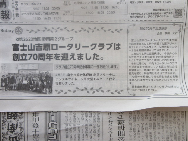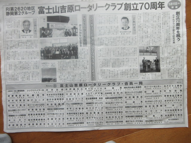 5月15日は私が会長を務める富士山吉原ロータリークラブの70周年記念式典事業がグランド富士で行われます。それに先立ち、前日の14日の富士ニュースや岳南朝日新聞さんにインフォーメーション記事が掲載されました。