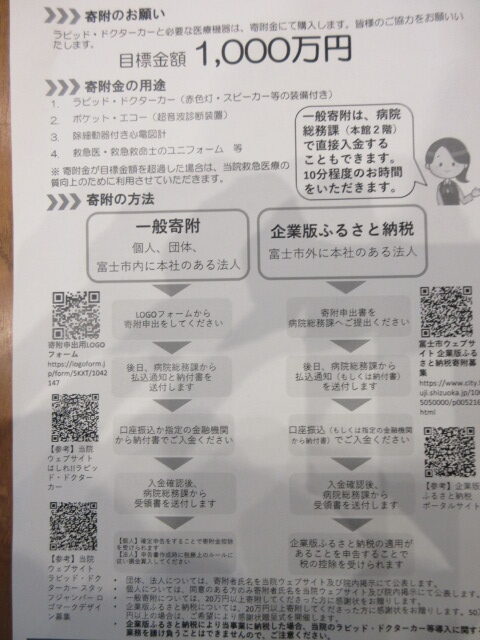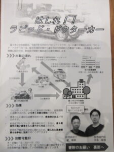 これにより心臓疾患や脳疾患に対して緊急治療が求められる中では、助かる命を助ける事に絶大な効果があります。当面は、木曜、金曜の2日間の運行となりますが、今後365日すべての運行を目指していきます。市民にとっては大変良い朗報であります。ただ、このラピッド・ドクターカーと必要な医療機器は寄付金において賄われます。現在、その寄付金の募集が始まっています。私は新病院建設特別委員会の委員長を務めています。現在、計画策定が進められている中で、3次救急に進む上でも救急医療の充実は求められていますが、今後の事を含めて、ラピッド・ドクターカー運行は重要なことで、様々な団体、企業、個人等々に寄付の協力要請をお願いされていますので、個人的な協力として所属団体のロータリークラブでチラシを配布してお願いをしてきました。