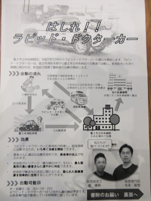 富士市では救急医療の充実を図る上で、富士市立中央病院では令和7年12月からラピット・ドクターカーの運行が開始されます。