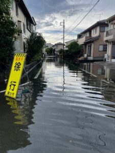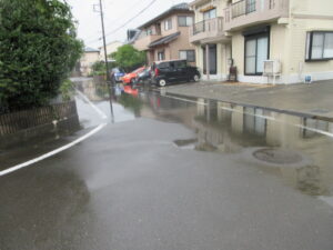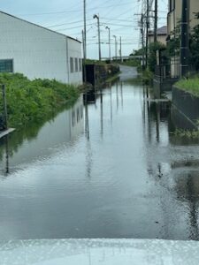 聞けば線状降水帯のような大雨が午前2時過ぎから降り、一気に家屋前が冠水したそうです。台風でもないのに予期せぬ冠水です。ただ、台風15号の時同様に家屋までの大きな被害は出ませんでした。区長から河川課へ連絡し水害対策でのポンプも稼働しており、満潮も過ぎましたので道路冠水箇所は水が引いています。今回、ポンプを初めて稼働させました。以前の会合でも発電機がないことの課題もありましたが、やはり周辺の方からのもう少し稼働を早くできないかの要望はありました。事前の対応も含め今後の稼働方法は住んでいる人、地域、水防団、業者の方を含めた中での大雨が降った時の対応はしっかりと協議しなければいけない事であると感じます。
