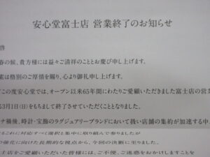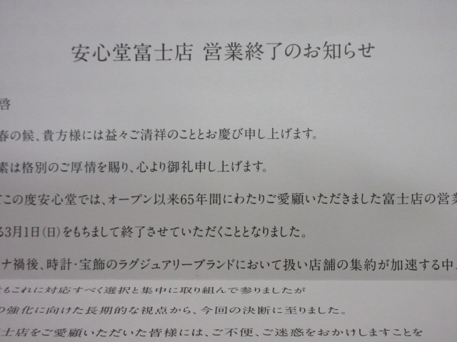 名前の通り安心して時計やメガネ、宝飾品等を買い求めてきた人が多いお店でありますが、その安心堂さんからのお手紙には、65年間にわたりご愛顧いただいた富士店の営業を3月1日をもって終了するという事でした。