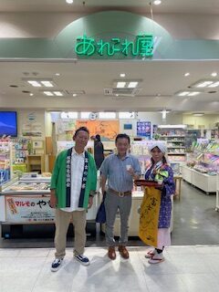 娘夫婦に持たすお土産を買いにあれこれや屋さんによると富士のお茶サービスを茶業組合の専務とお茶娘、農政課職員で対応していました。娘夫婦のお土産をあれこれ屋で買いながら、お茶サービスを受けました。