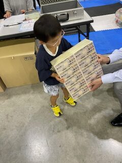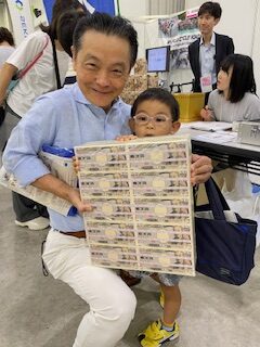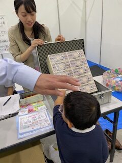 その後、プラミング体験、鋳物でのキーホルダー制作、そして、銀行ブースで一億円の重さを孫と体験。