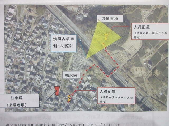 浅間古墳のライトアップとして浅間古墳側にスポットライトが当てれれると共にに浅間古墳内の立木20本に緑色のライトが照射されます。前日には、市指定史跡の千人塚古墳の史跡公園が供用になります。それを記念しての特別ライトアップであると思います。来年度より、浅間古墳の発掘事業が始まります。