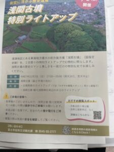 歴史に光が当てられることにすぐ近くに住む議員としてもワクワクしています。ぜひ、発掘前の浅間古墳のライトアップ、気になる方は見に来てください。詳細は、お知らせも含め地域では回覧板にチラシがお知らせで入ります。また、10月号の千人塚古墳の共用も含め広報富士に掲載されます。