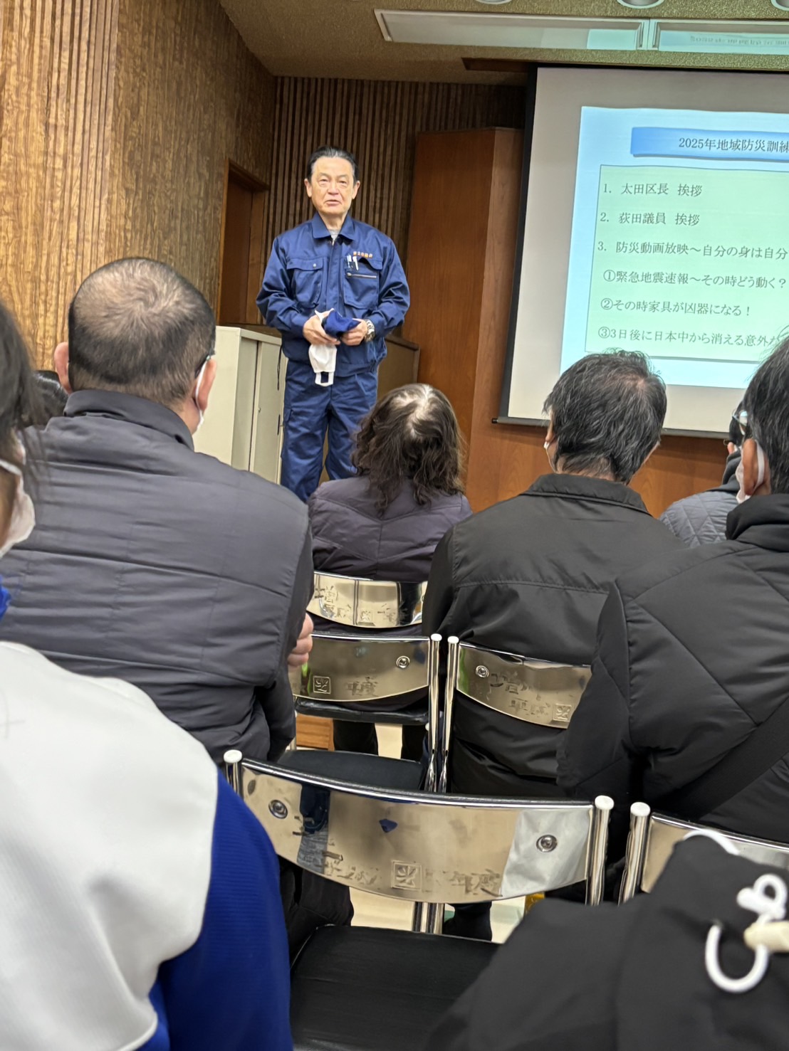 私も挨拶させて頂きましたが、本日の防災訓練は、自分の身は自分で守る自助、地域で助け合う共助の再確認の機会である事です。当然、家での家具やテレビ等の固定や備蓄、また、地域での避難場所、安否確認及び一人ではできない事に対しての地域での協力、防災マップ、防災アプリの確認も含めあらためて防災意識向上を図って頂きたい事へのお願いをしています。同時に、防災ではありませんが、医療の充実として、12月11日よりラピッドドクターカーが導入される事のお知らせをしました。