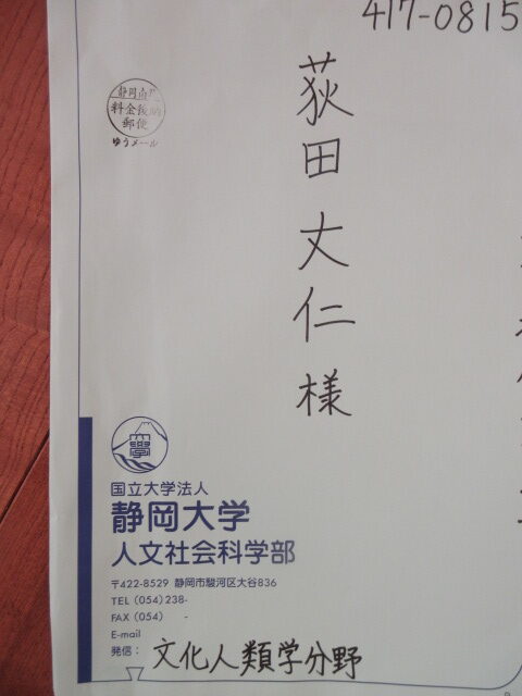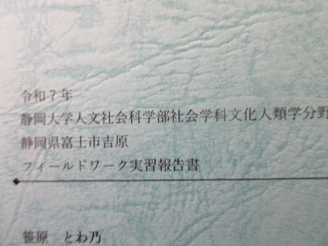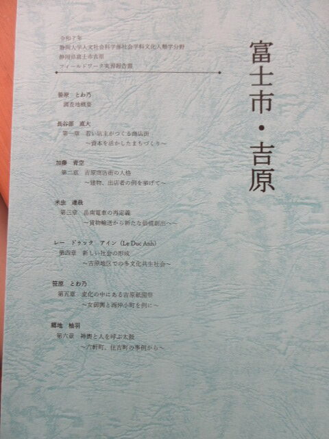 静岡大学の人文社会科学部社会学科文化人類学分野から郵送が送られてきましたので何かと思い、封を開けると富士市・吉原についての報告書が入ってました。昨年の5月位に私の所にフィールドワークで岳南電車について静大生の米虫君に議会応接室で取材を受けました。2時間位好き勝手に喋った記憶がありますが、その際に「また出来上がったら報告書を送ります」と言っていたことを思い出しました。
