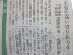 実は、既に一般質問を提出しましたが、広域連携の強化を求める質問をだしています。今回のトップ会談を契機に富士市と沼津市の将来展望も含め質問で確認しようと思っています。いずれにしても、新たな市長には、未来に向けて東部エリアのリーダーとしての活躍に期待したいです。