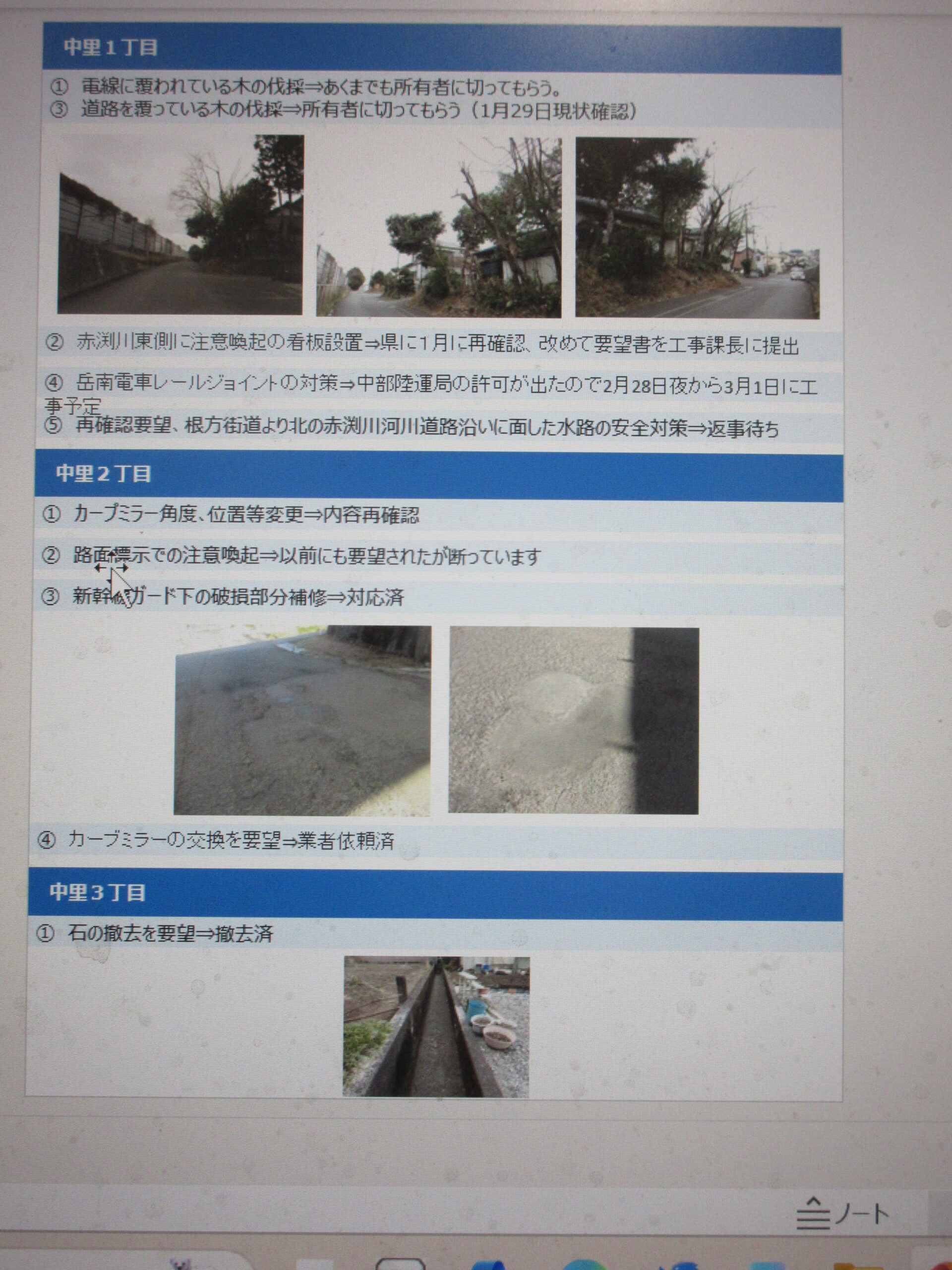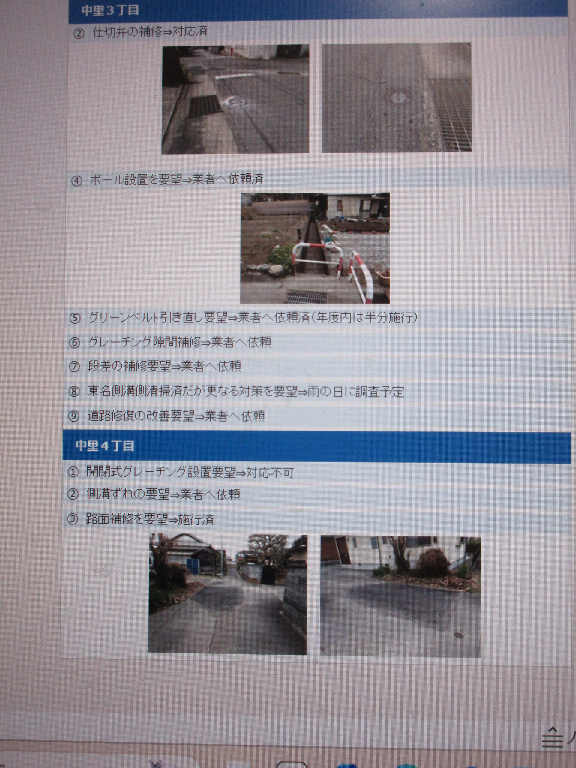 開催に先立ち報告書作成をしなければいけなく、毎年の事ですが、忙しい合間をぬって資料作成を行っています。中里区8町内で令和7年度要望箇所は37か所。