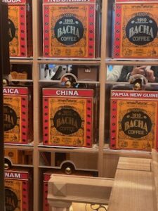 私も当然、並んで買い求めましたが、店内に入ると白と黒の市松模様の大理石の床に、サフラン色で統一された店内が広がります。空間にはコーヒーの香りが漂い、まるでモロッコの宮殿の中に入り込んだかのような気分に。コーヒーブティックの壁面には、世界35か国から集められた、200種類以上の100%アラビカ種のコーヒーが。コーヒー豆の購入はもちろん、プレゼントにもピッタリなドリップバッグボックスも販売しており、それぞれの香りを試すことができます。ですから、店内は甘い匂いが立ち込められています。販売されているコーヒーの匂いを嗅ぎながら、好みの香りのコーヒーを3種類買い求めました。