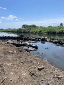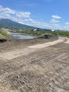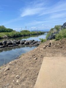 江尾江川の水害対策プランにおいて進められている対策の1つに緊急的に水害軽減の早期実現のために江尾江川の河川の一時拡幅が進められています。現在、一次拡幅を進めながら、江尾江川と沼川合流をさせる工事を6月30日まで行っており、沼川合流部分の工事を連休に入る前に確認に行ってきました。